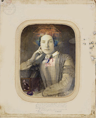 Untitled, from American Daguerreotypes, 2002 Digital collage 20 x 24 inches Unidentified woman, about 20 years of age, three-quarter length portrait, with Kennedy news on the table. Signed lower right in pencil